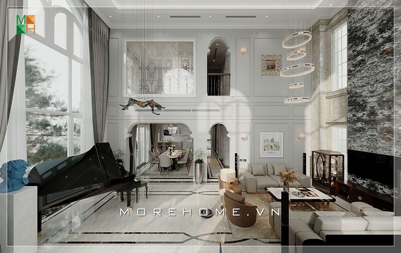 . Một mẫu thiết kế phòng khách sang trọng và đẳng cấp cho biệt thự được tạo ra bởi sự kết hợp hài hòa giữa các màu nội thất độc đáo, tạo nên một không gian thu hút.